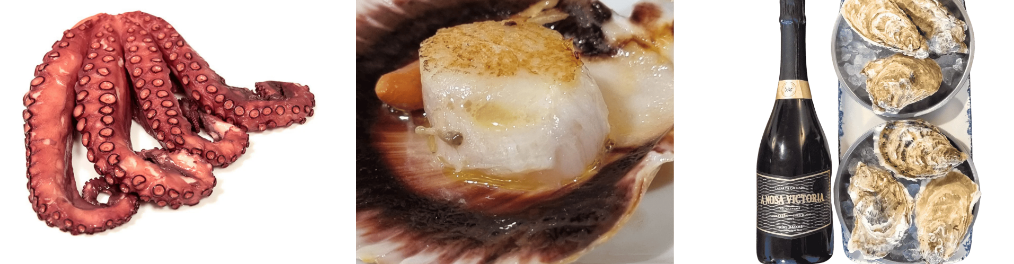 - Mariscos gallegos frescos, como percebes, nécoras, centollas, mejillones, almejas, vieiras, camarones y ostras.